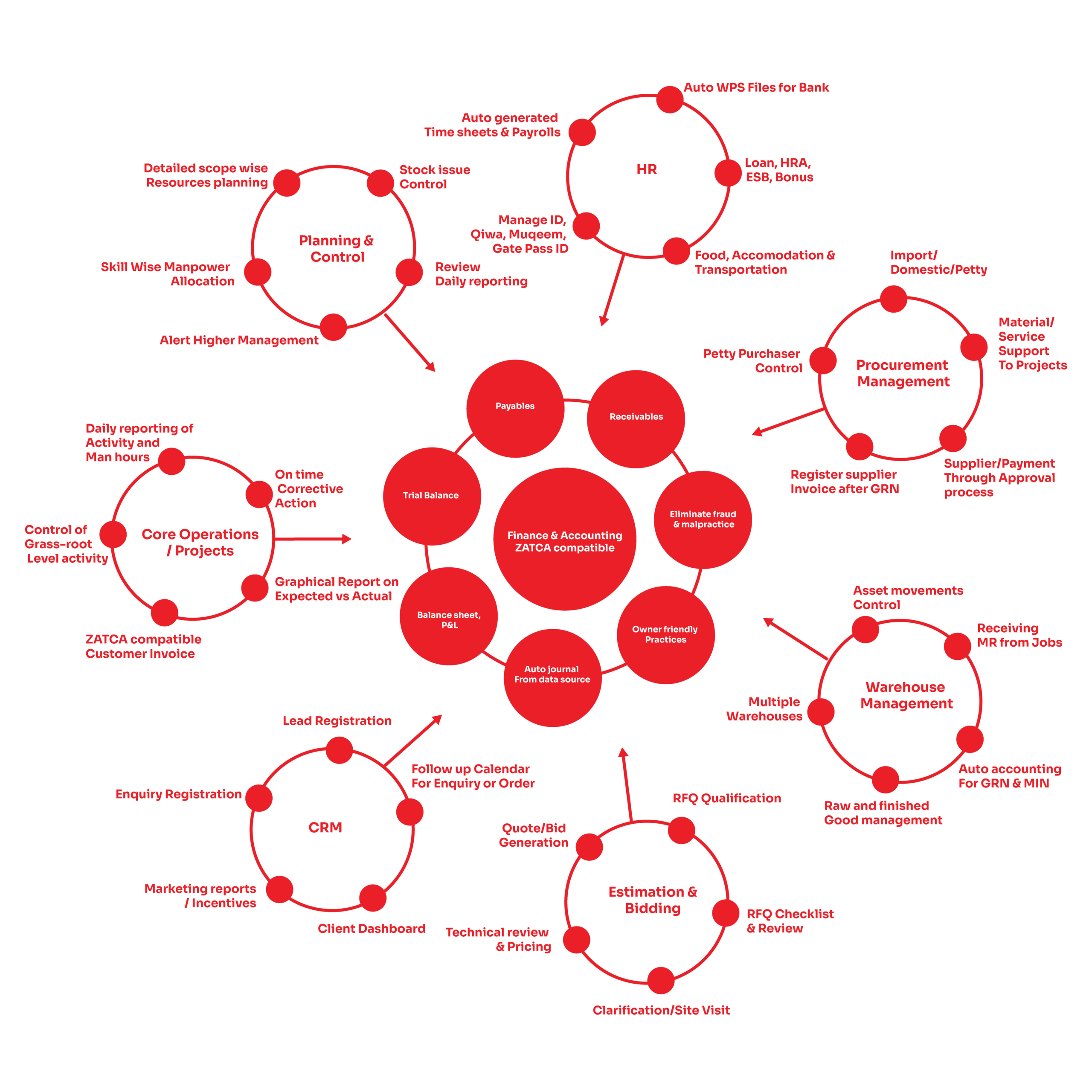 Zaintropy brings Finance & Accounting to the center of your organization, connecting projects, site activities, manpower, procurement, inventory, sales, and payroll into one integrated system.